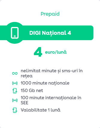 DIGI Naţional 4 – 4 euro / lună şi primiţi minute şi SMS-uri nelimitate în reţea, 1000 de minute naţionale, 150 GB internet mobil şi 100 de minute internaţionale în SEE;