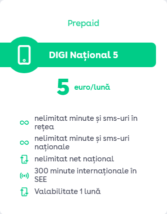 DIGI Naţional 5 – 5 euro / lună şi primiţi nelimitat minute şi SMS-uri naţionale, internet mobil nelimitat şi 300 de minute internaţionale în SEE;