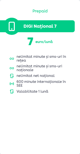 DIGI Naţional 7 – 7 euro / lună şi primiţi nelimitat minute şi SMS-uri naţionale, internet mobil nelimitat şi 600 de minute internaţionale în SEE.