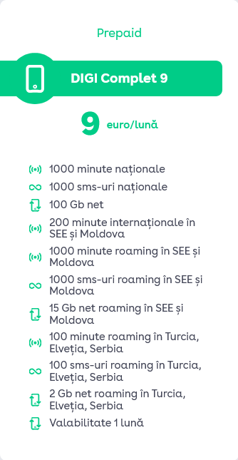 DIGI Complet 9 – 9 euro / lună şi primiţi 1000 minute naţionale, 1000 SMS-uri naţionale, 100 GB internet mobil, 200 minute internaţionale în SEE şi Moldova, 1000 minute roaming în SEE şi Moldova, 1000 SMS-uri roaming în SEE şi Moldova, 15 GB internet mobil în roaming SEE şi Moldova, 100 minute roaming în Turcia, Elveţia şi Serbia, 100 SMS-uri roaming în Turcia, Elveţia şi Serbia şi 2 GB internet mobil în roaming în Turcia, Elveţia şi Serbia;