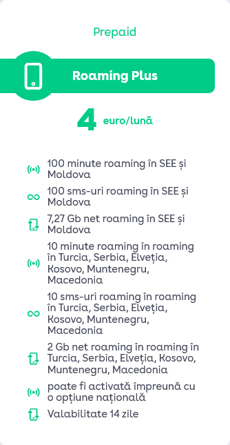 Roaming Plus – 4 euro / lună şi primiţi 100 minute roaming în SEE şi Moldova, 100 SMS-uri roaming în SEE şi Moldova, 7.27 GB internet mobil în roaming SEE şi Moldova, 10 minute roaming în Turcia, Elveţia, Serbia, Kosovo, Muntenegru şi Macedonia, 10 SMS-uri roaming în Turcia, Elveţia, Serbia, Kosovo, Muntenegru şi Macedonia şi 2 GB internet mobil în roaming în Turcia, Elveţia, Serbia, Kosovo, Muntenegru şi Macedonia (aceasta poate fi activată doar împreună cu o opţiune naţională);