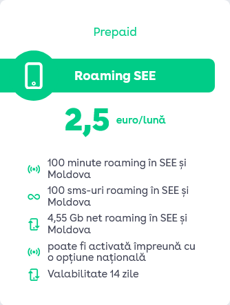 Roaming SEE – 2.5 euro / lună şi primiţi 100 minute roaming în SEE şi Moldova, 100 SMS-uri roaming în SEE şi Moldova, 4.55 GB internet mobil în roaming SEE şi Moldova (aceasta poate fi activată doar împreună cu o opţiune naţională).