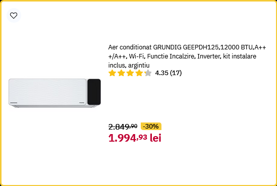 aer condiţionat Grundig GEEPDH125 cu 12.000 BTU – 1994.93 lei;