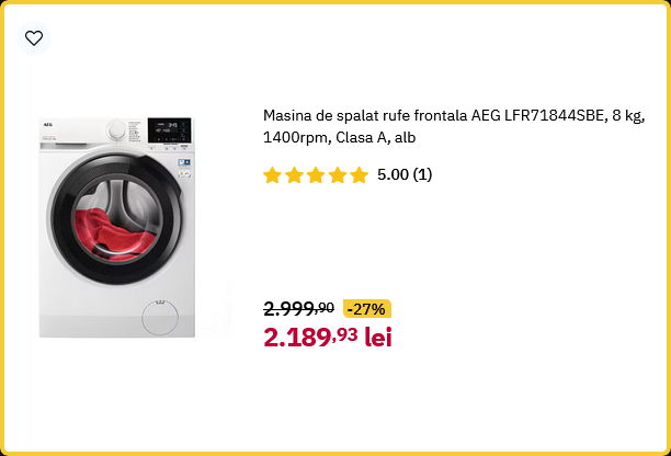 maşină de spălat rufe frontală AEG LFR71844SBE de 8 kilograme – 2189.93 lei;