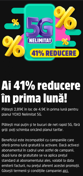 Orange YOXO a lansat recent o nouă ofertă, una care este promovată deja destul de activ în mediul online. Conform acesteia, abonamentul Best Deal cu Nelimitat 5G poate fi activat până pe 28 februarie cu doar 2.89 euro / lună, sumă în care primiţi următoarele resurse: