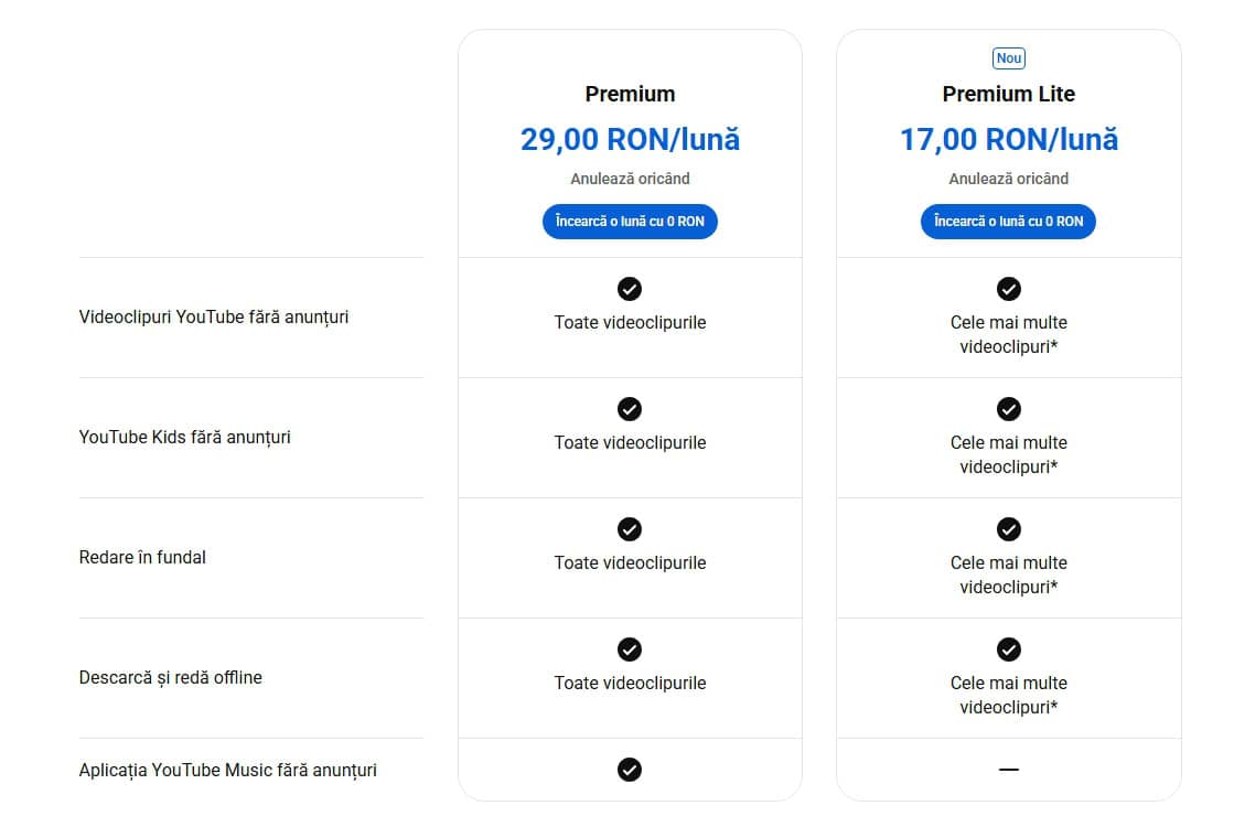 În toamna anului trecut se lansa oficial şi în România abonamentul YouTube Premium Lite. La acel moment aflam că abonamentul costă 17 lei / lună, sumă pentru care primeam mai puţine reclame şi cam atât. În aceşti bani poţi: ![]() Aşa cum probabil v-aţi dat seama, YouTube Premium Lite nu oferă acces la YouTube Music Premium, tocmai pentru a păstra nişte aşi în mânecă şi pentru abonamentul standard YouTube Premium. Acesta din urmă este disponibil în România sub 3 forme astfel: