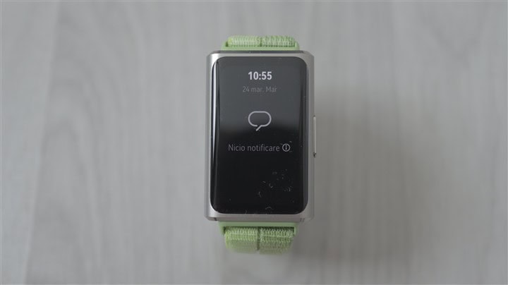 Grosimea este redusă, imediat sub 9 mm, iar greutatea, luând în calcul și cureaua textilă, este de doar 23 de grame. Sincer, cu greu pot spune că simt la mână această brățară, ceea ce nu pot spune despre niciun smartwatch pe care l-am testat până acum. Oricât de ușor ar fi orice ceas, tot nu prea poate coborî spre 20 de grame (inclusiv cureaua), deci unul dintre avantajele unei brățări de fitness este clar acesta – cât este compactă și de ușoară.
