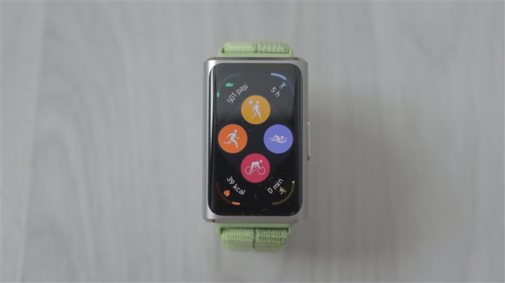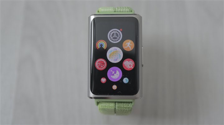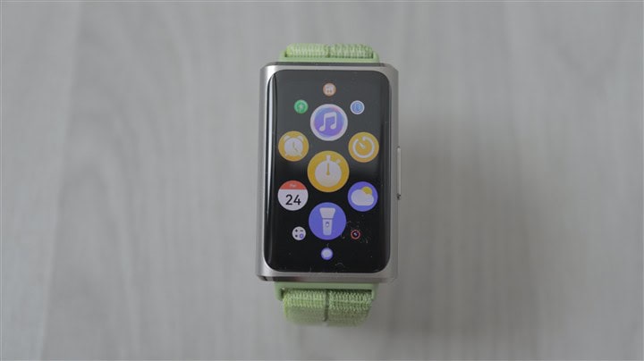 Apoi, avem un ecran rectangular, cu diagonala de 1.62 inch și colțuri puternic rotunjite. Este un AMOLED cu rată de refresh la 60Hz și rezoluție de 482 x 286 pixeli, în consecință cu o densitate de circa 347 ppi, deci comparabilă cu cea regăsită pe multe dintre smartwatch-urile cu pretenții. Luminozitatea maximă în peak poate atinge 2000 niți, din nou o cifră demnă de ceasurile inteligente premium. Sunt disponibile peste 100 de fețe de ceas, dar există și posibilitatea de activa AOD (Always On Display)