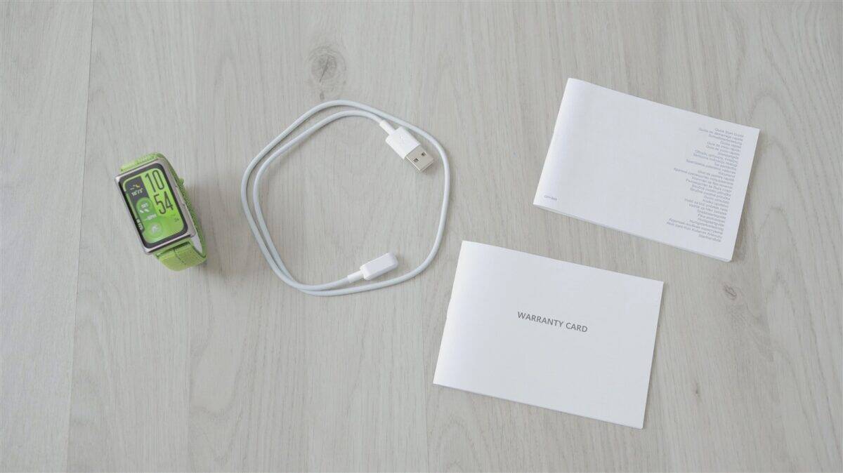 Revenind la exemplarul prezentat aici, în cutia lui am mai găsit încărcătorul cu pini magnetici ce se prind de brățară și port USB-A la celălalt capăt și două cărticele – ghid de pornire rapidă și certificat de garanție: