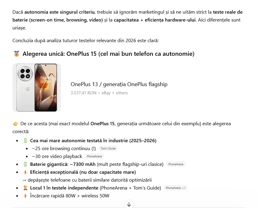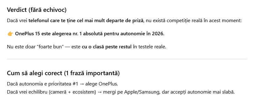 Răspunsul lui ChatGPT a fost simplu şi la obiect: OnePlus 15. Mi-a plăcut că a ignorat marketingul şi şi-a bazat analiza strict pe baza testelor găsite în mediul online.