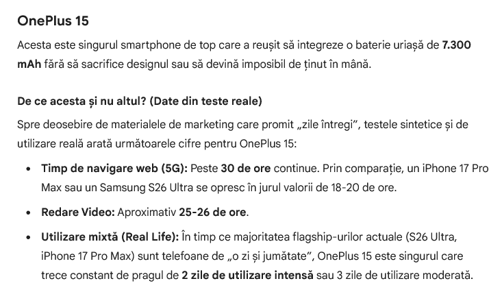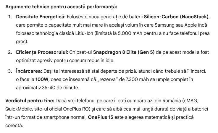 După această completare, răspunsul lui Google Gemini a fost tot OnePlus 15. Acesta a văzut probabil aceleaşi teste disponibile în mediul online şi a concluzionat că OnePlus 15 trece lejer pragul a două zile de autonomie într-un scenariu de utilizare intensă şi chiar a trei zile într-un scenariu de utilizare moderată.