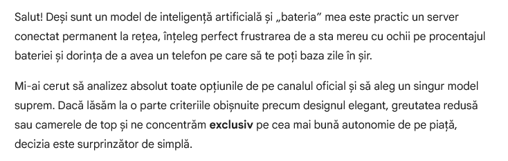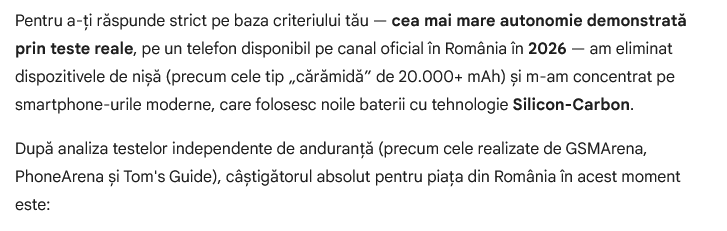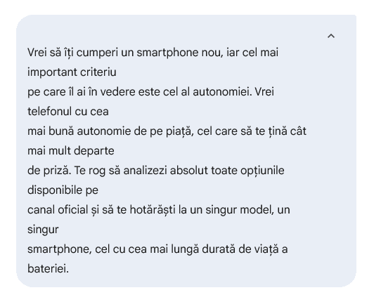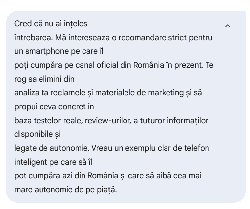 Am revenit ulterior către el şi am completat solicitarea cu: „Cred că nu ai înţeles întrebarea. Mă intereseaza o recomandare strict pentru un smartphone pe care îl poţi cumpăra pe canal oficial din România în prezent. Te rog sa elimini din analiza ta reclamele şi materialele de marketing şi să propui ceva concret în baza testelor reale, review-urilor, a tuturor informaţilor disponibile şi legate de autonomie. Vreau un exemplu clar de telefon inteligent pe care să îl pot cumpăra azi din România şi care să aibă cea mai mare autonomie de pe piaţă.”