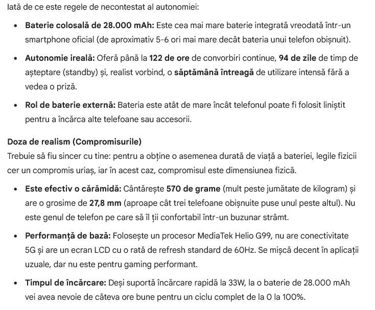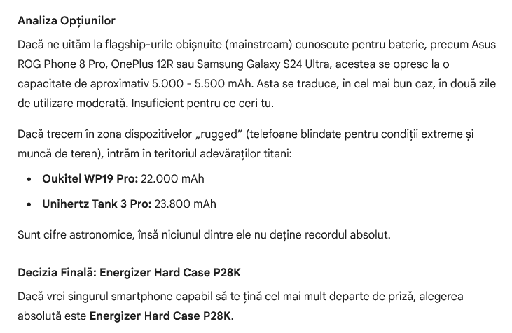 Din păcate Google Gemini nu a înţeles întrebarea, acestea oferind un răspuns oarecum contextual. El a ales pur şi simplu câteva smartphone-uri rugged cu baterii uriaşe, modele de genul cărămidă. Recomandarea lui a fost Energizer Hard Case P28K, telefon care nu se mai vinde nicăieri în lume.