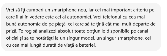 „Vrei să îţi cumperi un smartphone nou, iar cel mai important criteriu pe care îl ai în vedere este cel al autonomiei. Vrei telefonul cu cea mai bună autonomie de pe piaţă, cel care să te ţină cât mai mult departe de priză. Te rog să analizezi absolut toate opţiunile disponibile pe canal oficial şi să te hotărăşti la un singur model, un singur smartphone, cel cu cea mai lungă durată de viaţă a bateriei.”