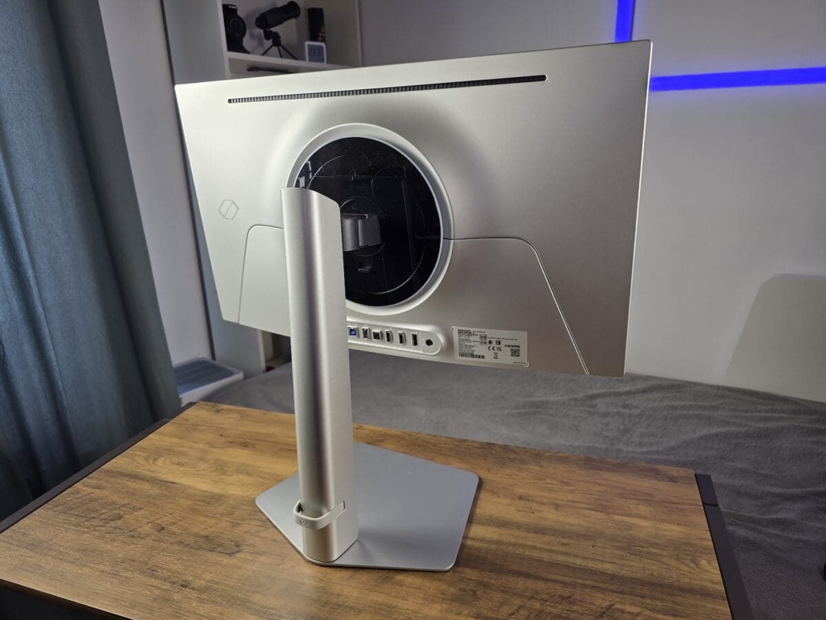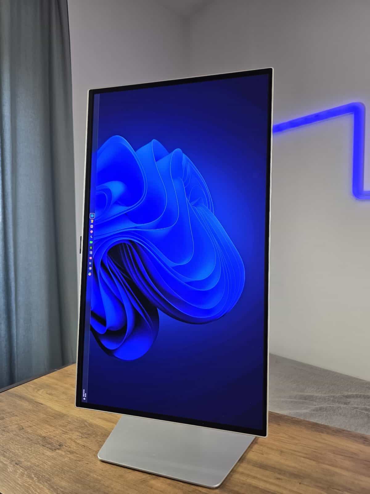 Monitorul arată într-un mare fel. Este subțire, argintiu pe spate, iar standul îi conferă polivalență în utilizare, extrem de facil îl reglezi în landscape sau portrait – printr-o simplă rotire. Standul metalic este greu și conferă cumva siguranță, nu simți că trebuie să ai grijă suplimentară.