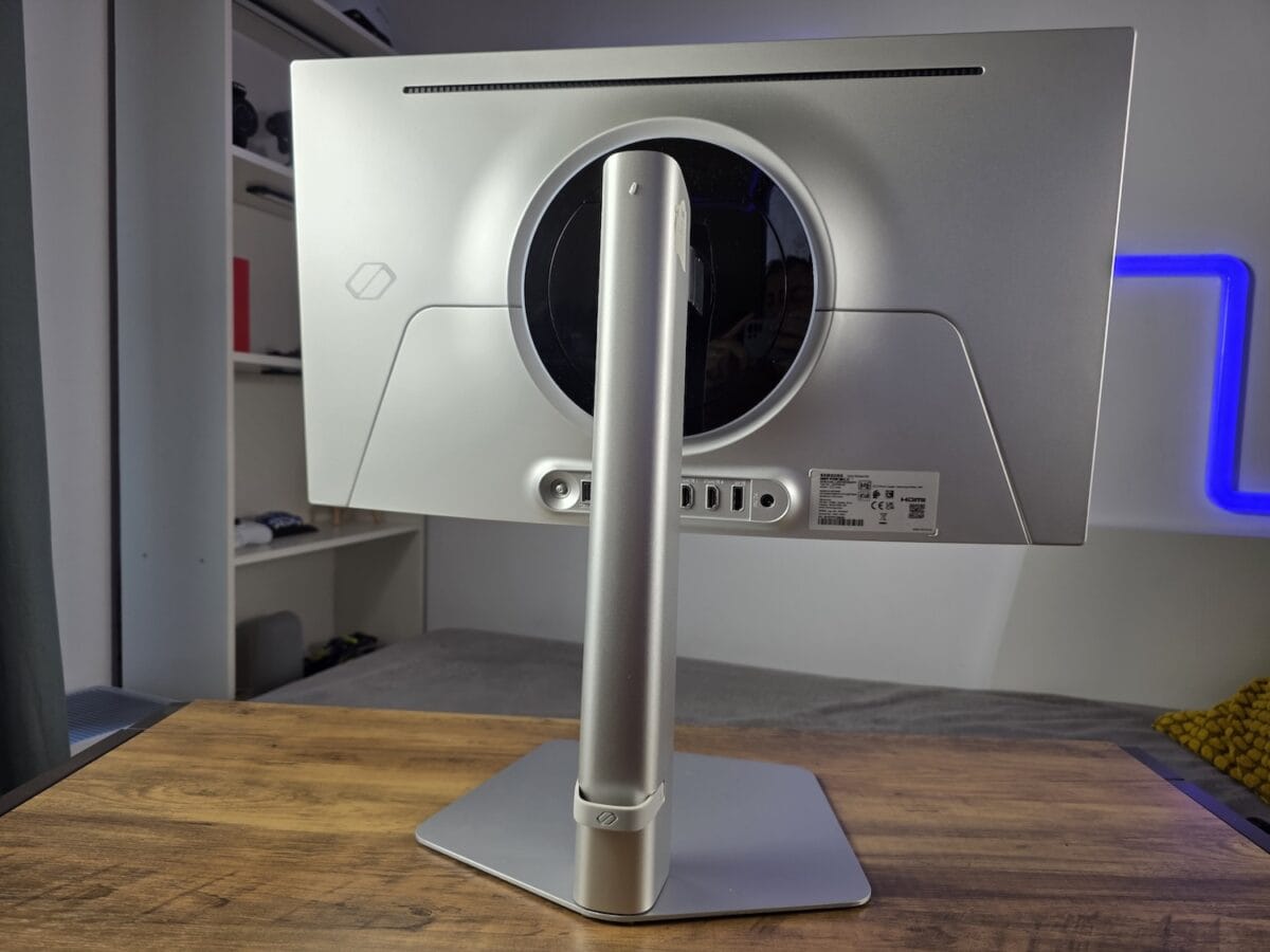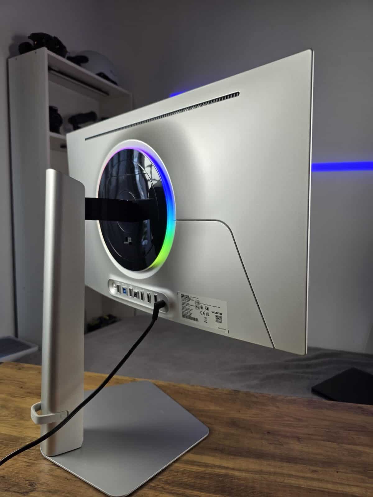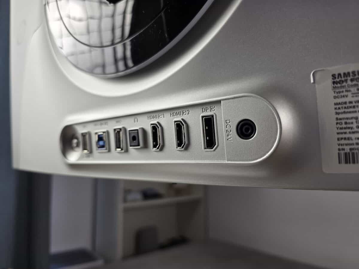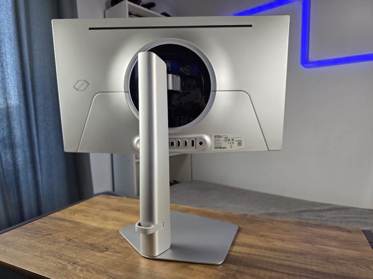 Toate elementele de conectivitate sunt poziționate în partea spate. Acolo dați de jack-ul de alimentare, portul DisplayPort 1.4, 2 x HDMI 2.1, jack de căști, 2 porturi USB-A și altul USB-B, pentru care aveți și cablu în pachet.