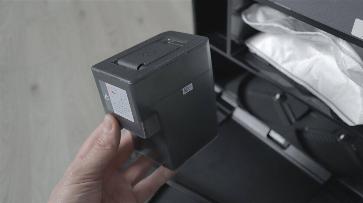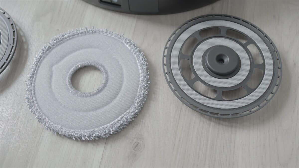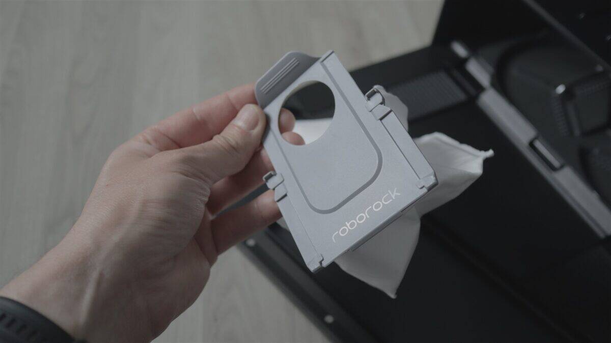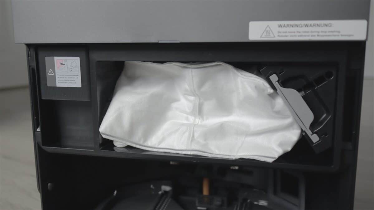 Pe zona superioară este capacul care se prinde cu trei magneți și sub care este recipientul pentru praf (259 ml), în care se găsește și filtrul de praf. Undeva în robot este și un recipient pentru apa cu detergent, care este trasă automat din stația de andocare. Nu ai acces la acest recipient cu capacitatea de 65 ml fiindcă de umplerea lui se ocupă automat stația.