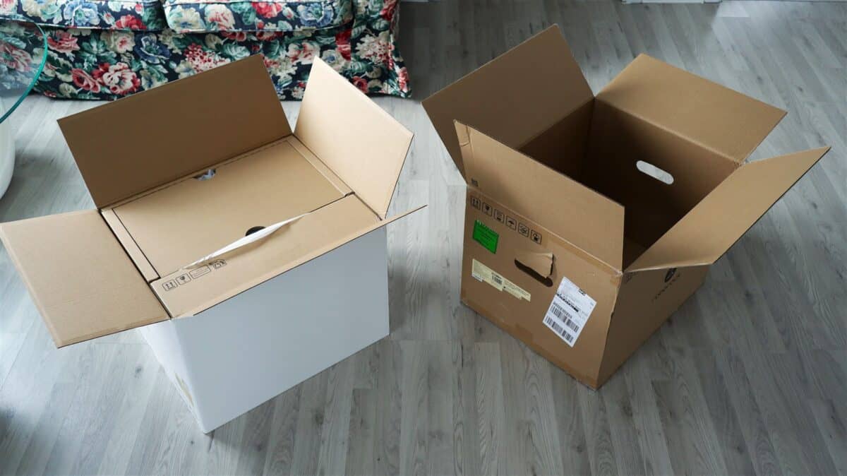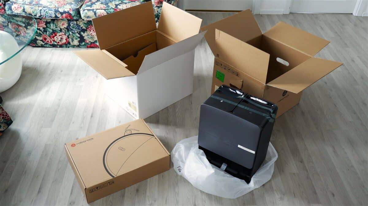 Roborock Saros 20 ajunge la client într-o cutie dublă (una exterior din carton maro simplu + una interioară albă), în care sunt robotul, stația de andocare, cele două mopuri, cablul de alimentare, rampa detașabilă pentru accesul robotului către stație și câteva pliante cu diferite informații.