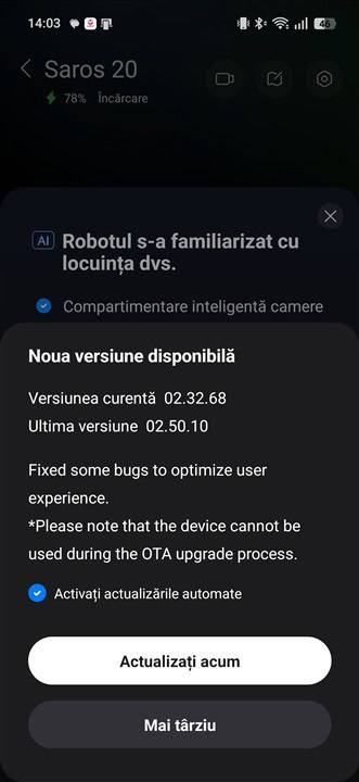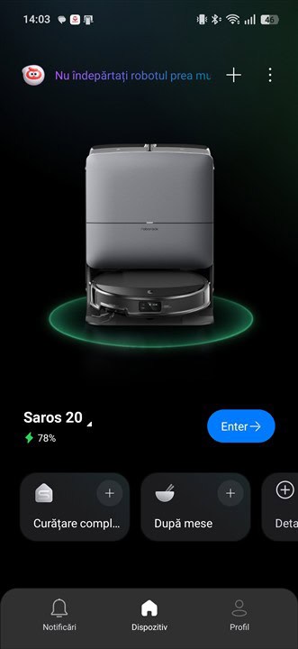 Pentru a începe utilizarea este nevoie să desfaci totul, să așezi stația acolo unde îți dorești, după care instalezi aplicația Roborock și urmezi pașii descriși. În cazul Saors 20, acesta a fost recunoscut fără a mai fi nevoie de alți pași, fără a „căuta” robotul. Fiindcă rețeaua Wi-Fi era deja salvată în aplicație de la Qrevo Edge 2 Pro, doar am selectat rețeaua de acasă și în maxim 2 minute aveam Roborock Saros 20 gata de acțiune, cum s-ar spune.