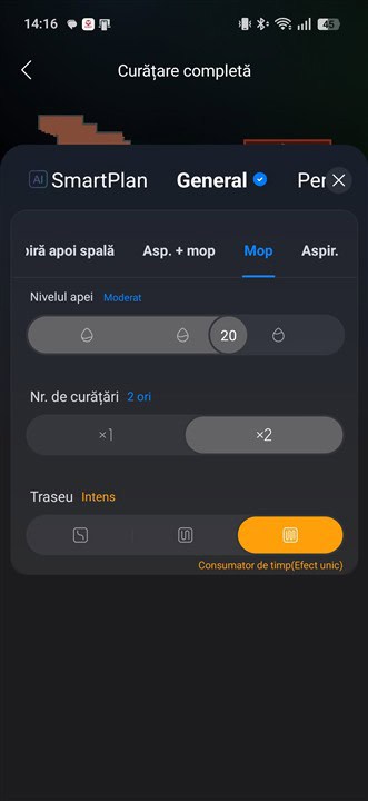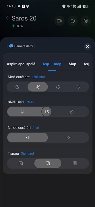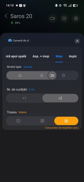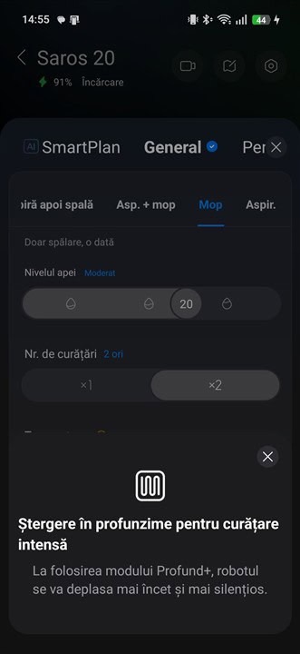 Cu totul gata în maxim 2 – 3 minute, Roborock Saros 20 pleacă să spele podelele și o poate face mai ușor, de nivel mediu sau intens, în funcție de cuma legi tu din aplicație. Sunt mai multe reglaje pentru cantitatea de apă care să fie distribuită pe mopuri, pentru modul de curățare (mai intens înseamnă că robotul se deplasează mai încet spre a curăța mai temeinic) și pentru numărul de treceri (o singură trecere sau două, în mod perpendicular una de cealaltă).
