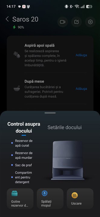 Dacă alegi doar aspirare din aplicație, atunci Roborock Saros 20 lasă automat mopurile în stație. Când vrei să și speli podelele, robotul face o pregătire a mopurilor, în sensul că dozează automat detergent și apă curată, pe care o încălzește bine și o distribuie apoi către mopuri și în rezervorul propriu din robot.