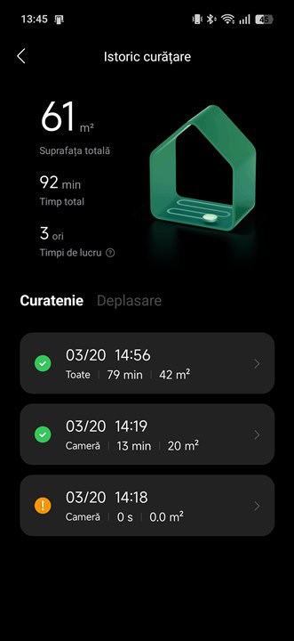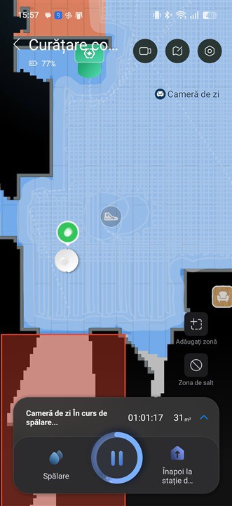Fiindcă am ales o spălare profundă a podelelor, Roborock Saros 20 a mers de trei ori către stație spre a curăța și pregăti din nouă cele două mopuri. Prin aceste opriri intermediare, robotul se asigură că ai mereu mopuri cât mai curate și practic nu plimbi mizeria dintr-o parte în cealaltă a casei.