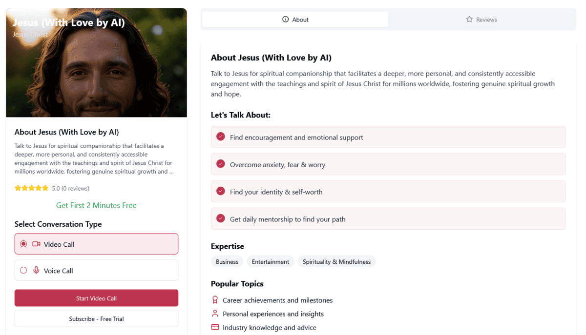 Aplicaţia online Just Like Me a introdus recent posibilitatea ca utilizatorii să poată face video call cu Iisus Hristos generat de AI. Pentru acest lucru se percepe o taxă de 1.99 dolari / minut, iar primele 2 minute sunt gratuite.