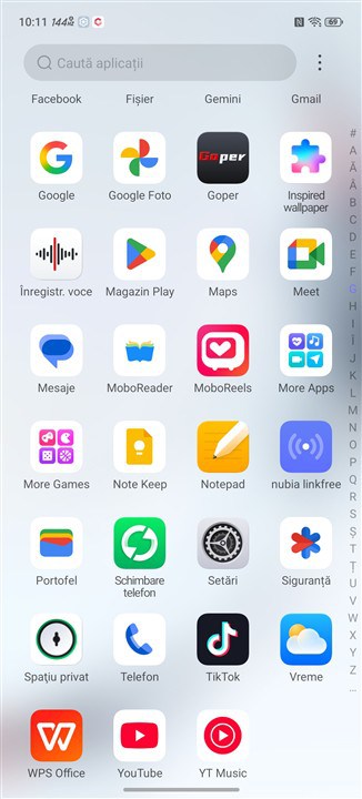 Ca aplicații preinstalate, am avut o surpriză plăcută. Aparte de cele de la Google, care sunt prezente în număr din ce în ce mai mare pe mai toate smartphone-urile recente, REDMAGIC a mai plusat pe 11 Air cu Block Blast!, Booking.com, Browser, Curățare, Facebook, Goper (aplicație unde ai acces la diferite accesorii REDMAGIC pe care le poți achiziționa separat), Inel rotativ al obiectivului (nu avea ce să caute pe acest telefon, fiind preluată greșit de alte modele ZTE), Inspired wallpaper (creează diferite fundaluri), MoboReader, MoboReels, More Apps, More Games, Notepad, nubia linkfree, Schimbare telefon, Spațiu privat, TikTok și WPS Office. Pot părea multe și poate că așa este, dar am văzut cu mult mai numeroase, chiar în exces în alte cazuri.