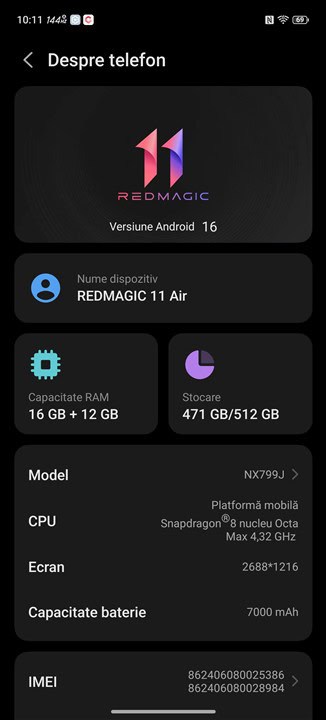 Pe de altă parte, când ne referim la memorie, fie ea RAM sau internă, REDMAGIC 11 Air nu face rabat. Avem minim 12 GB LPDDR5X Ultra (cu 16 GB în cazul de față) și 256 sau 512 GB spațiu stocare tip UFS 4.1. Așadar, foarte bine la memorie, cum de altfel este foarte bine și la chipset, chiar dacă nu este cel mai puternic posibil.