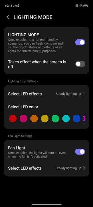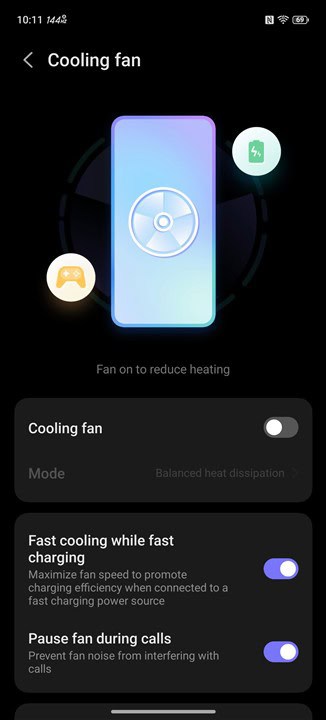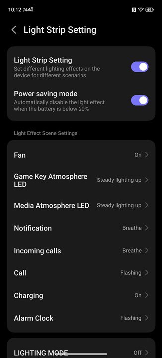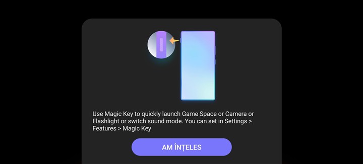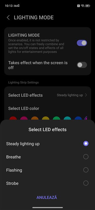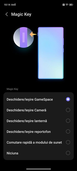 Însă partea de iluminare RGB nu se oprește doar la ventilator, mai avem și logo-ul REDMAGIC care se poate aprinde în multiple nuanțe și jocuri de lumini. Poți alege și la acesta când să se aprindă, la anumite acțiuni ori la deschiderea unor aplicații, dar poți alege și să luminezi continuu, fie doar când ai ecranul aprins, fie chiar oricând, atât timp cât bateria nu coboară sub un anumit nivel.