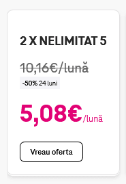 Practic, pe toată perioada contractuală de 24 de luni, 2 abonamente Nelimitat 5 sunt oferite la un cost total de doar 5.08 euro / lună. În aceşti bani primiţi: